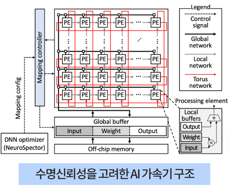데이터 타일과 PE 배열의 최소공배수(LCM)를 이용한 순환 알고리즘,PE 배열의 토러스 연결과 같이 기존 AI 가속기 구조를 크게 변형하지 않으면서 구현이 용이한 수명신뢰성 개선 기술
