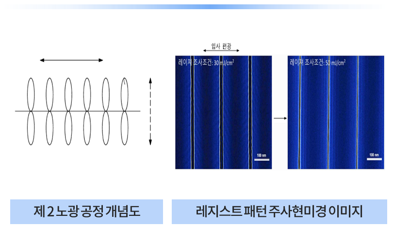 제 2 노광 공정에서 입사광의 편광 방향을 제어함으로써 레지스트 패턴 내 분자 배열을 조절하여 해상도를 높이고, 선 가장자리 거칠기를 줄이며, 선폭 및 피치 제어