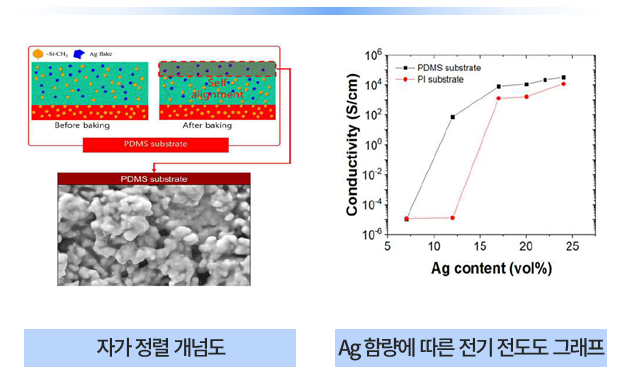 전도성 필러와 신축성 소재의 계면 특성 제어를 통해, 낮은 필러 함량에서도 전기 전도도를 확보할 수 있는 신축성 배선 및 기판 제조 기술경화 과정에서 발생하는 자가 정렬(Self-alignment) 메커니즘을 활용하여, 전기적 성능과 기계적 유연성을 동시에 만족