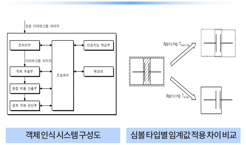 다이어 그램 이미지(P&ID 등) 내 다수의 심볼과 객체를 자동으로 인식하고 중복 객체를 정확히 판단하여 심볼 인식 성능을 향상시키는 객체 인식 시스템 및 방법객체 추출, 중첩 비율 계산, 중복 객체 판단, 인공지능 학습부를 결합하여 심볼 크기 편차 ·고밀도 배치 상황에서도 높은 인식 정확도 구현