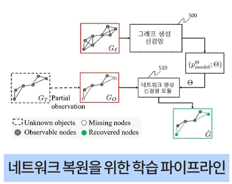 그래프 심층 생성형 AI 를 활용해 숨겨진 관계를 추론하고 다양한 노드 순서를 고려한 후보 네트워크 생성 후 확률 기반으로 최적 네트워크 선택하여 라벨 데이터 없이도 미싱 노드 관계 복원 가능