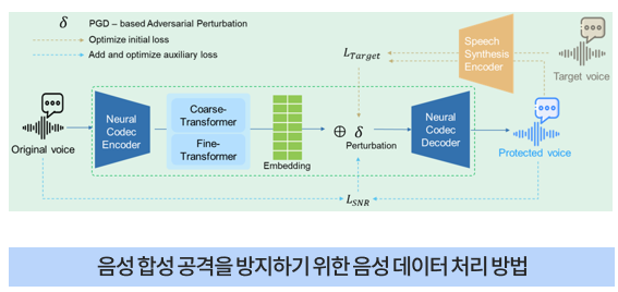 - 딥보이스 모델의 악용을 방지하기 위해 음성에 노이즈(적대적 퍼터베이션)를 주입하여 원본 화자의 목소리를 갖지 못한 음성이 생성되도록 하는 기술