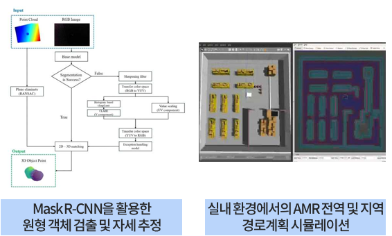- 조도 변화나 비구성 환경에서도 안정적으로 물체를 인식하고,그 인식 결과를 기반으로 로봇의 작업 동작을 자율 계획·제어할 수 있는 비전-모션 통합 기술